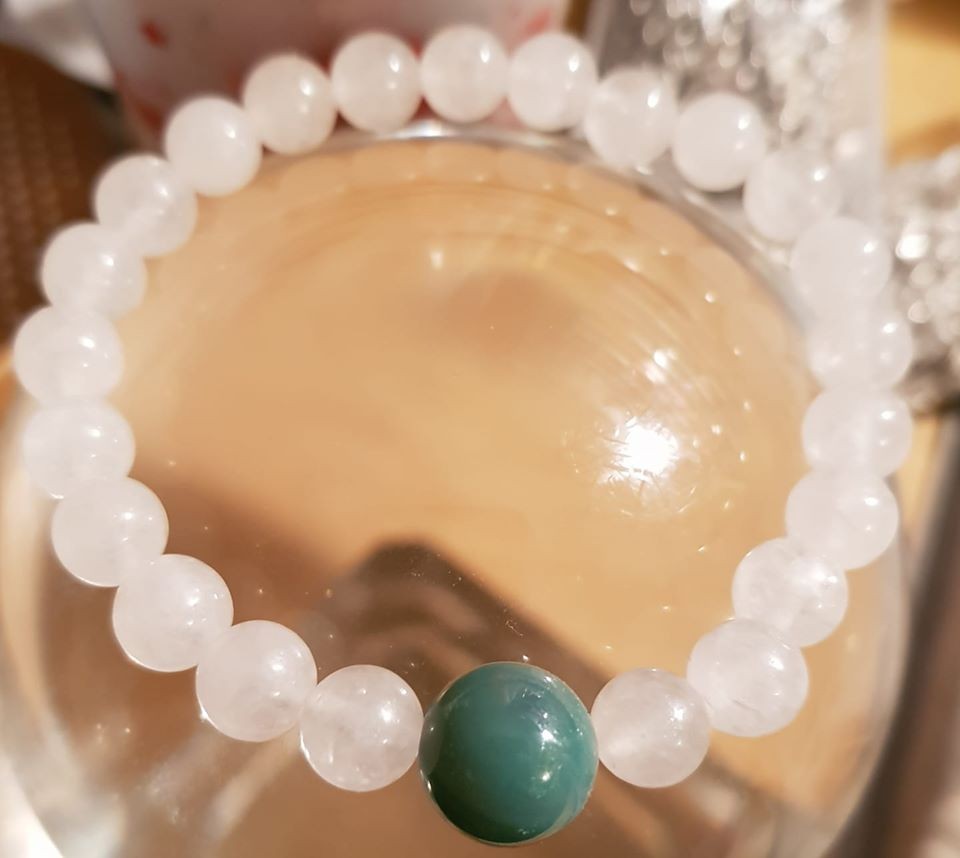 Je trouvais effectivement le bracelet un peu triste et terne, trop monochrome, alors je l'ai fini avec une perle d'agate verte de 12 mm.