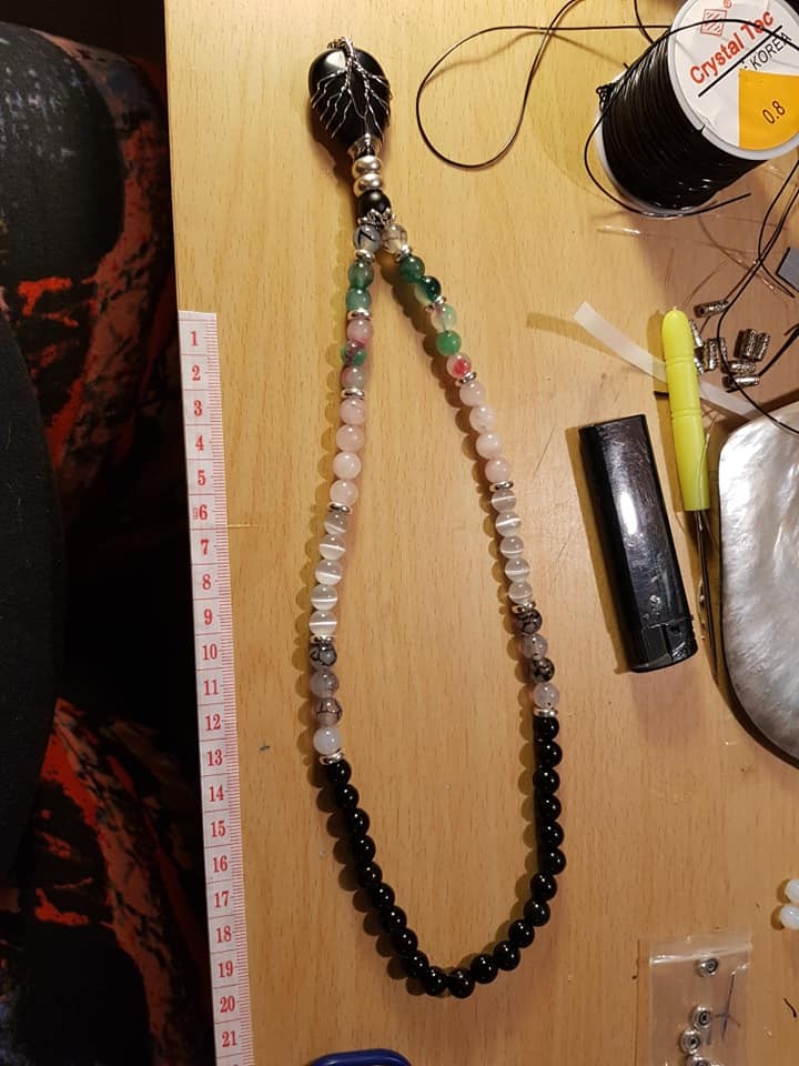collier d'onyx, d'agates d'oeil de chat et de quartz rose.